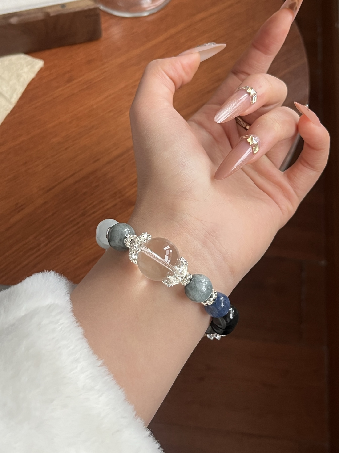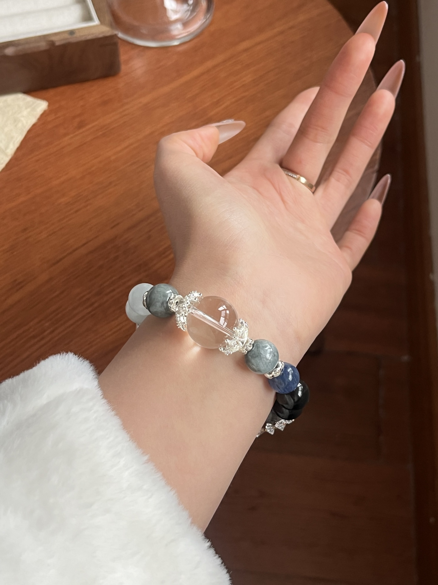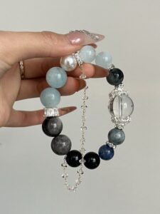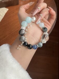 This bracelet uses high-quality crystals such as Designed with White Crystal, Sea Blue Treasure, Eagle Eye Stone, Blue Crystal, Silver Shine Stone, Shell Bead, Silver jewelry.