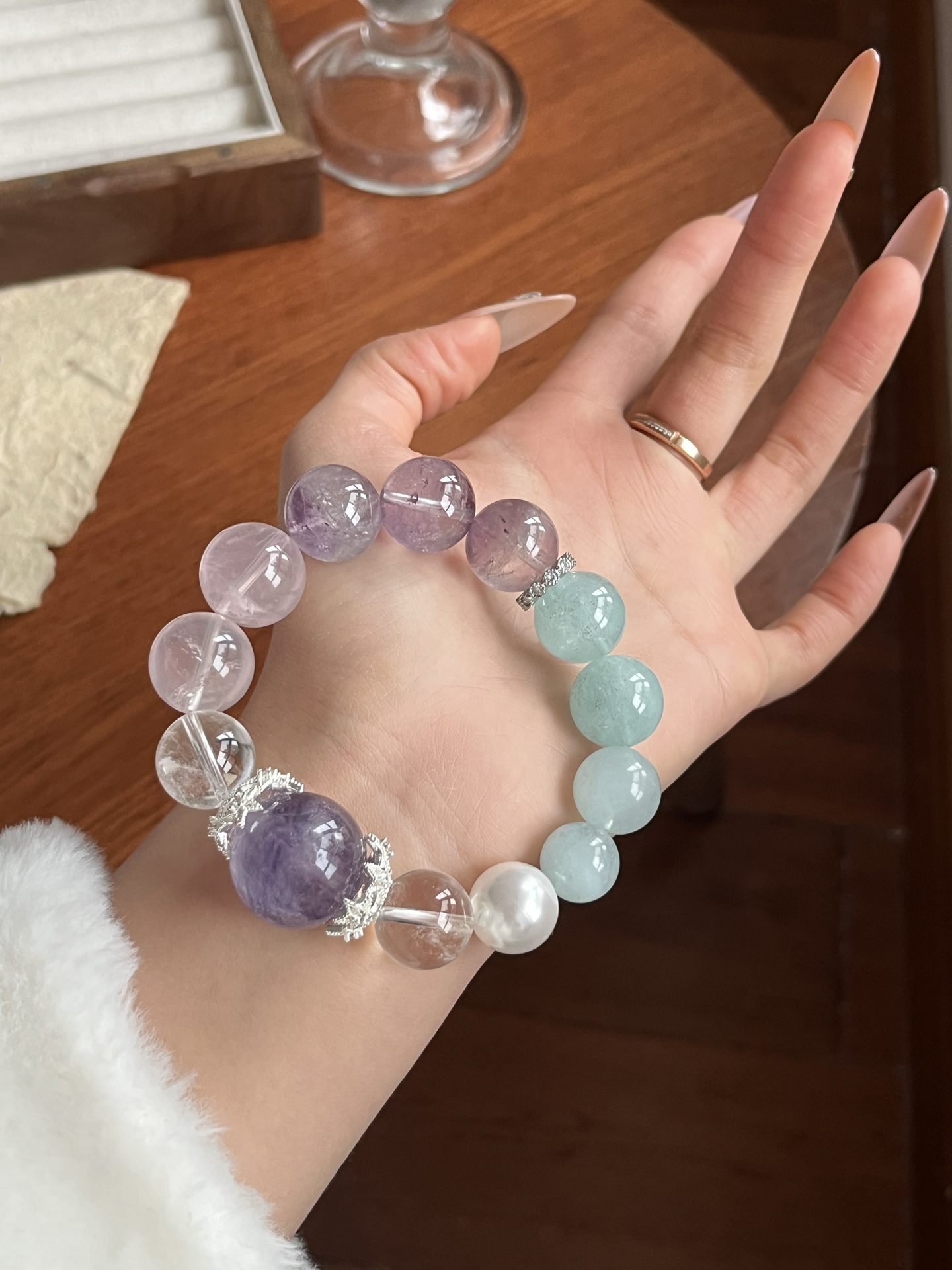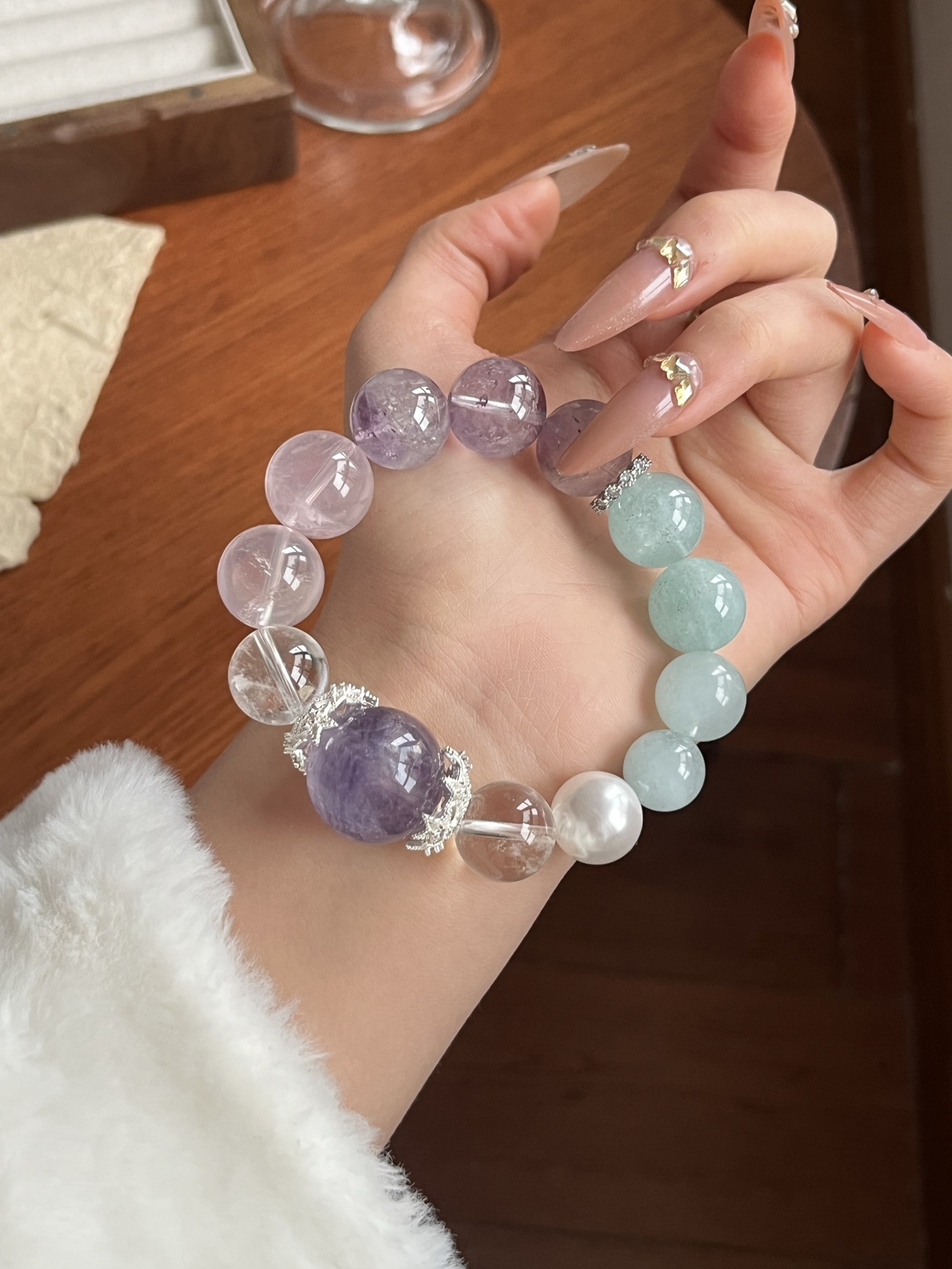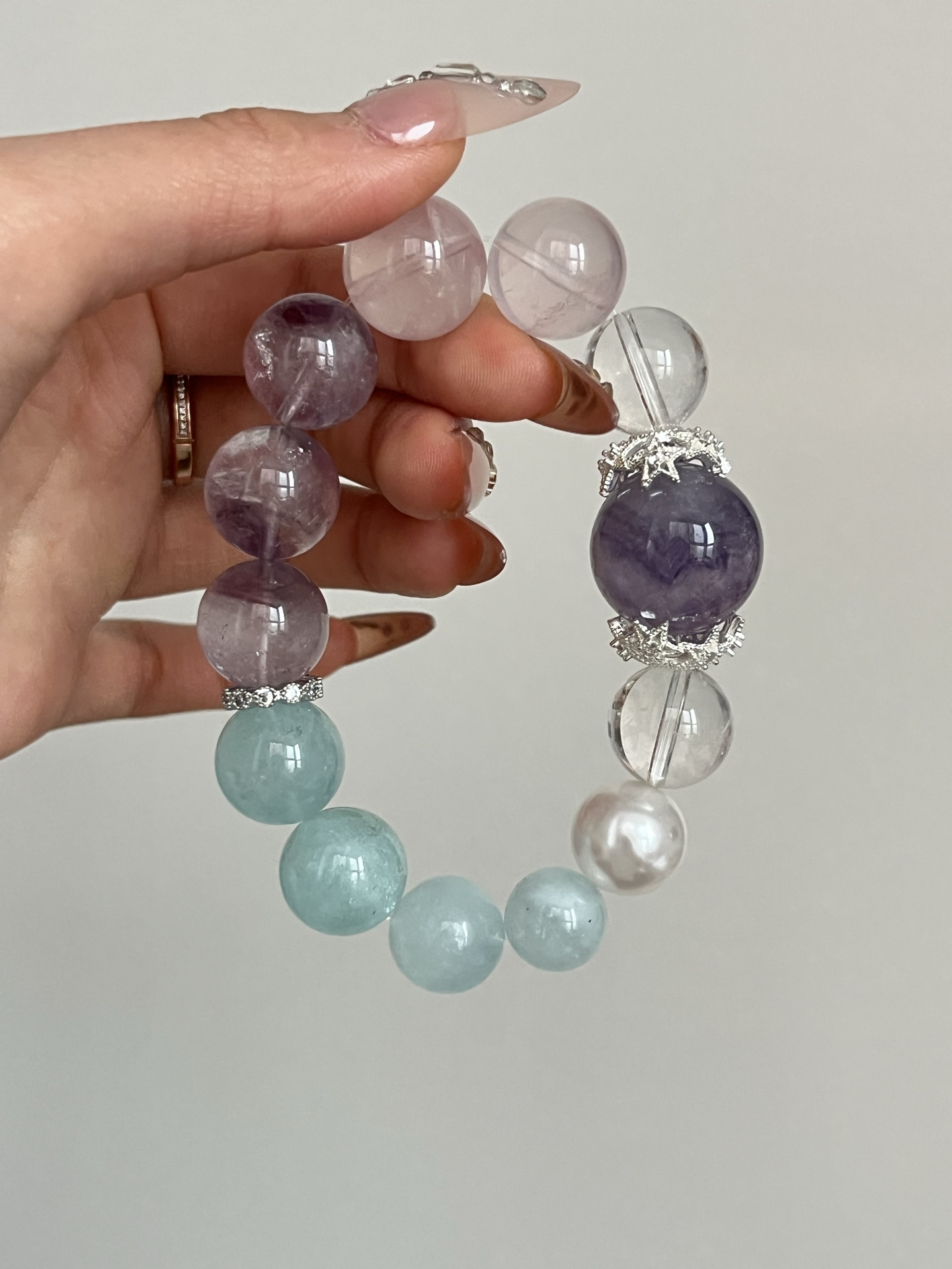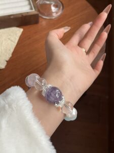 This bracelet uses high-quality crystals such as Designed with White Crystal, Pink Crystal, Purple Crystal, Sea Blue Treasure, Fluorite, Silver jewelry.