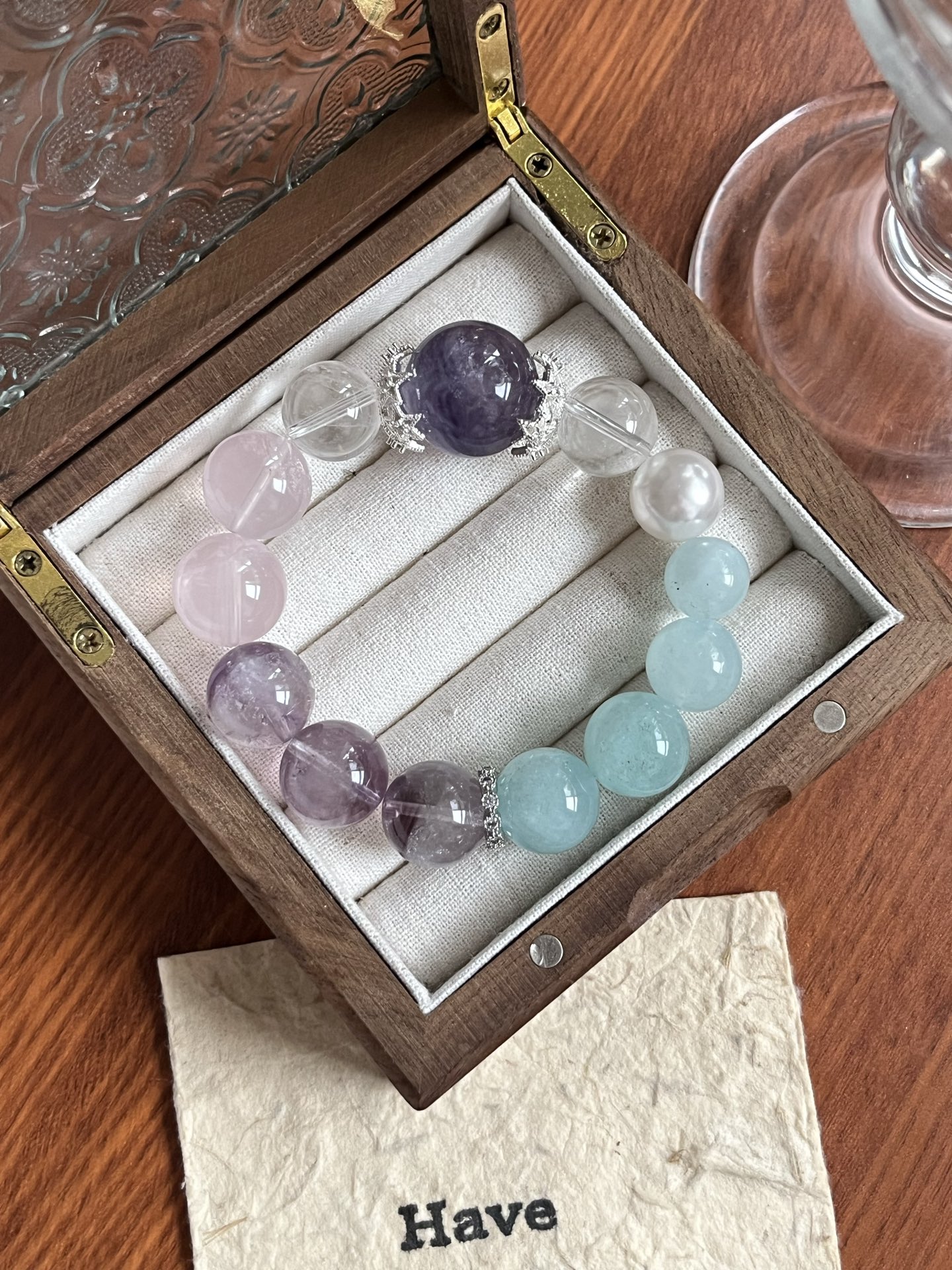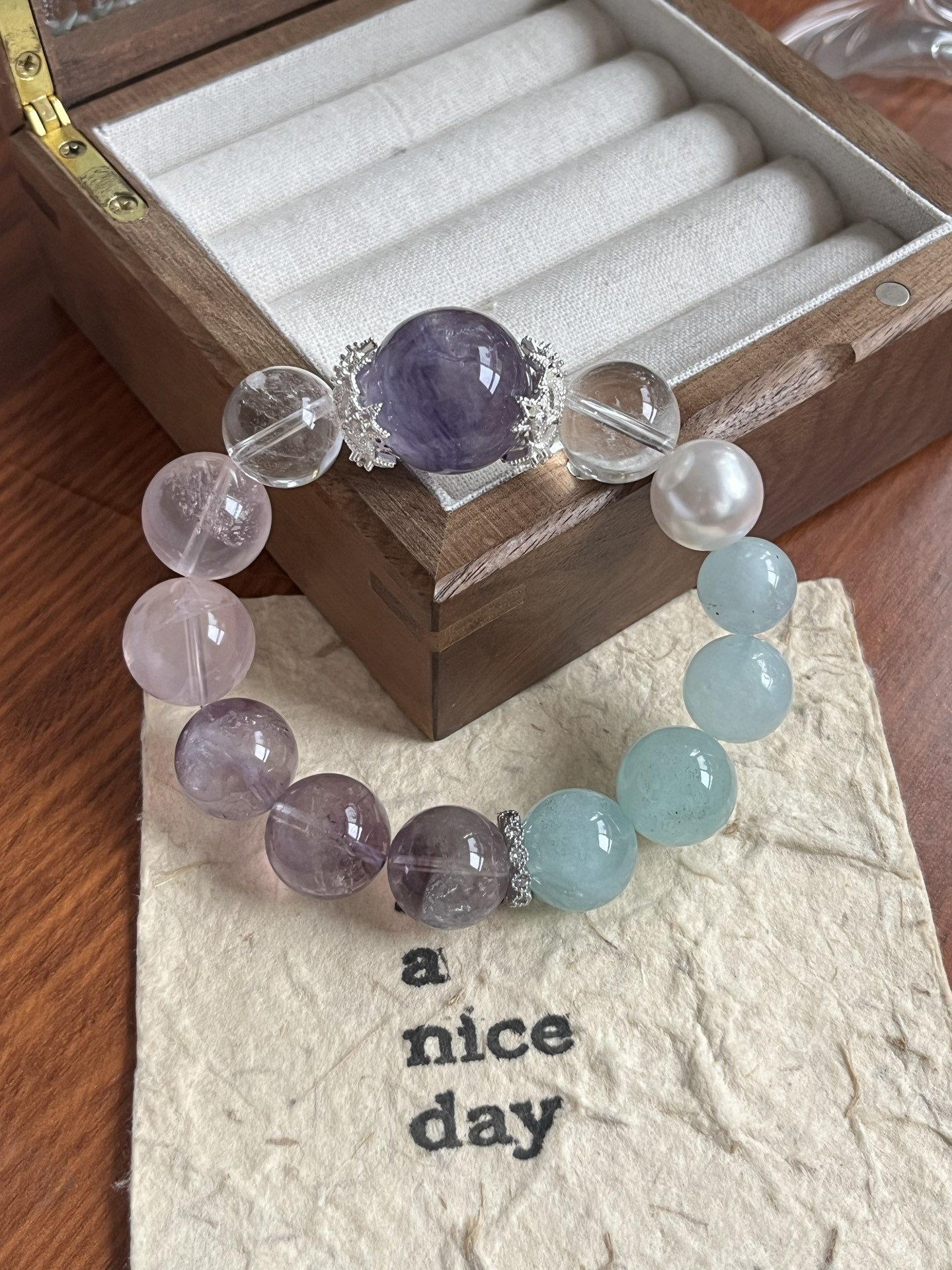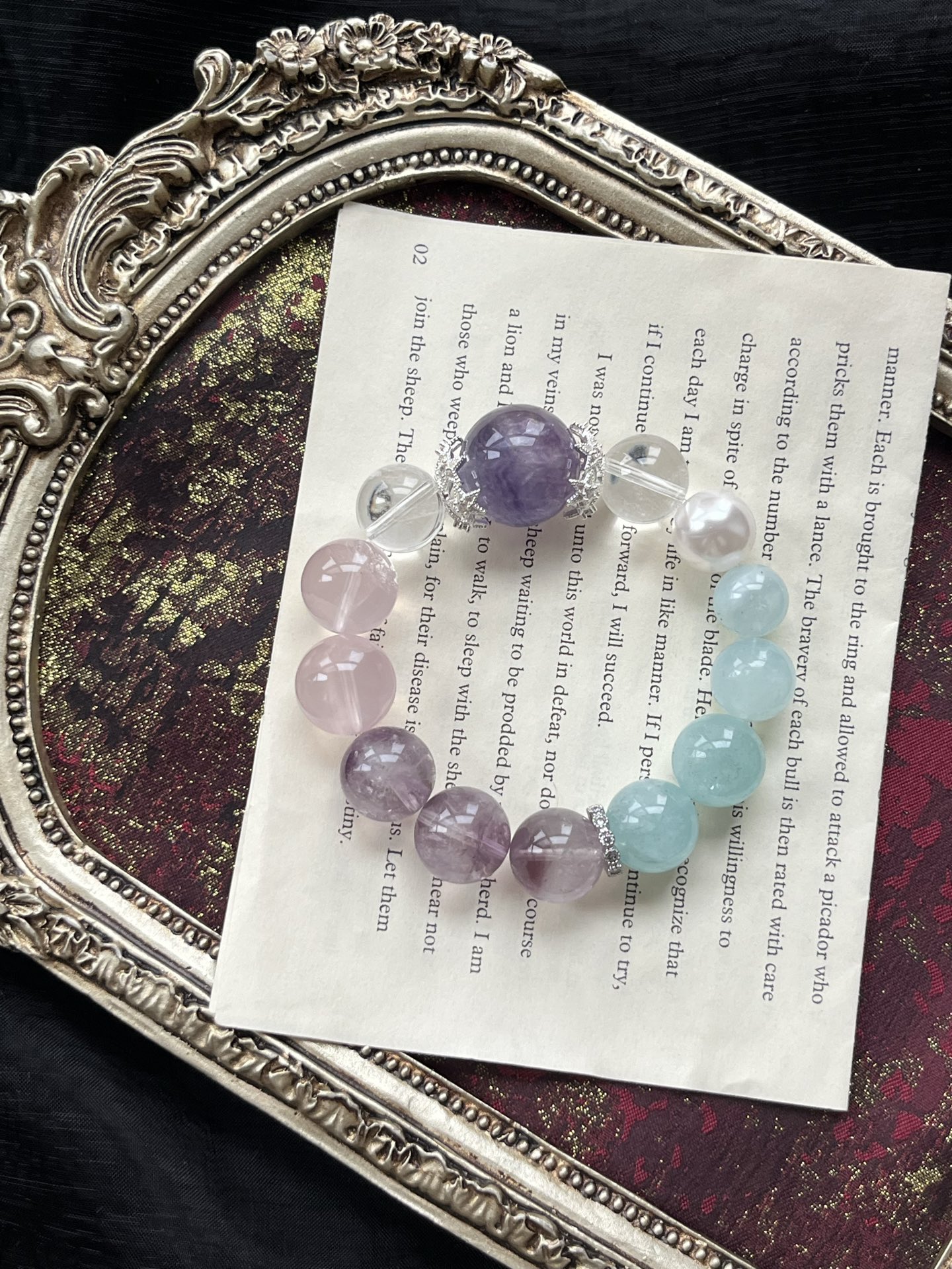 This bracelet uses high-quality crystals such as Designed with White Crystal, Pink Crystal, Purple Crystal, Sea Blue Treasure, Fluorite, Silver jewelry.