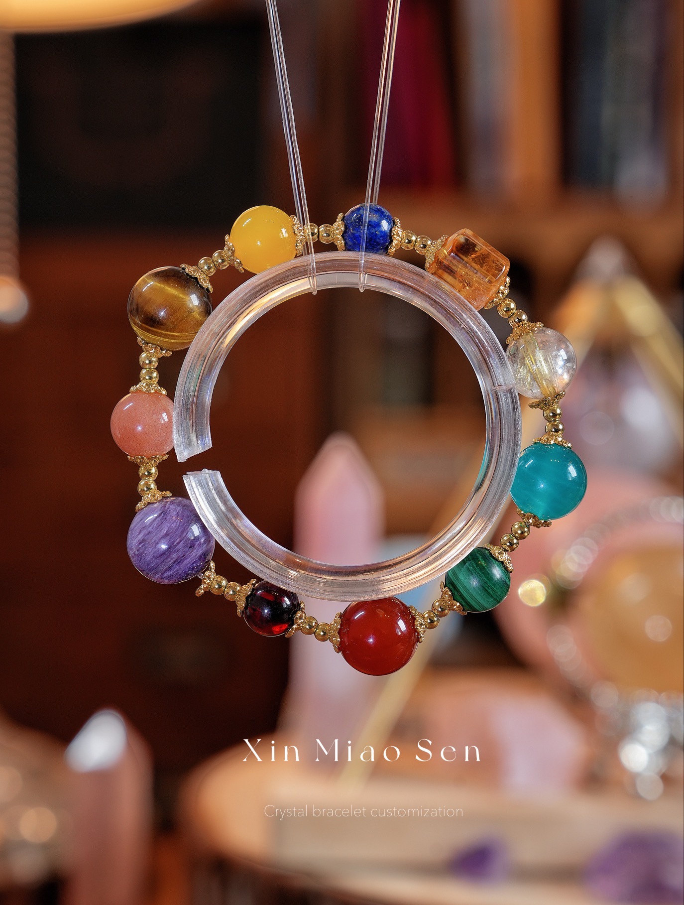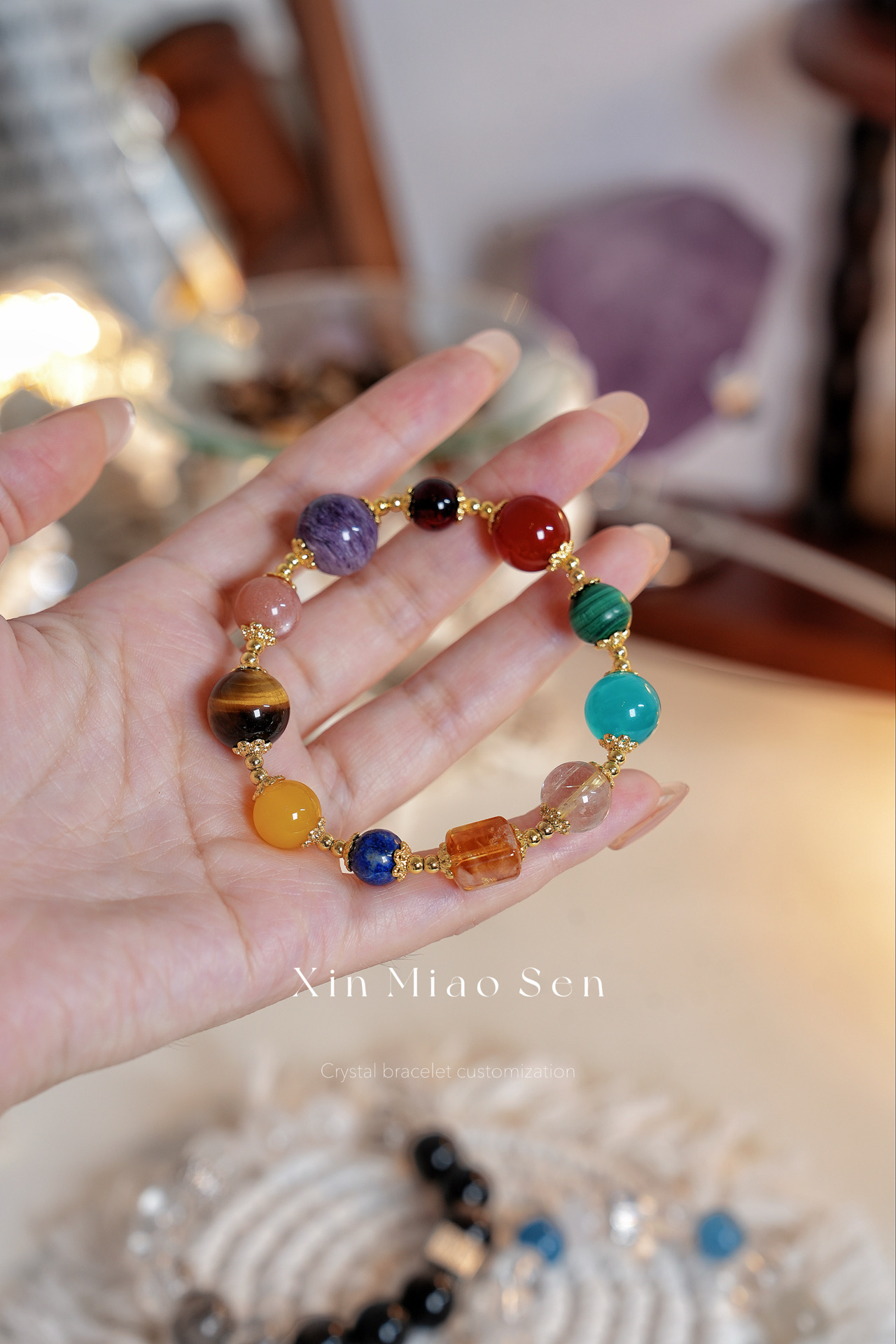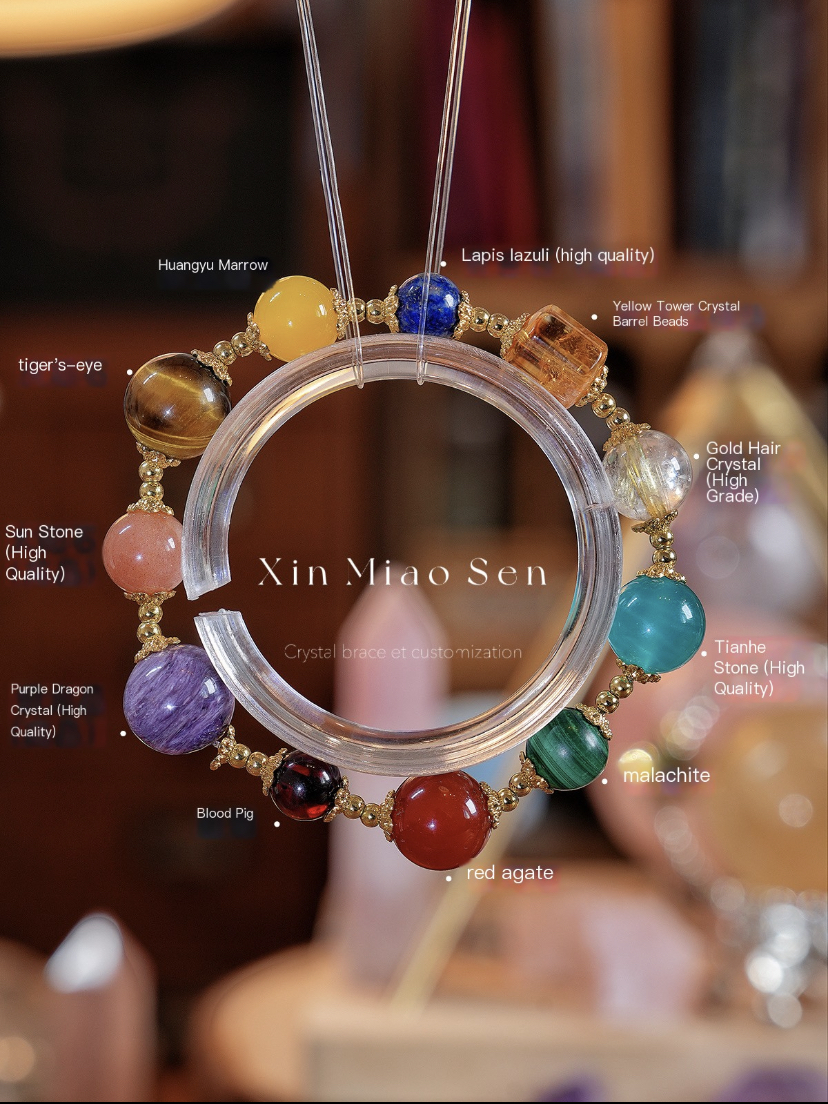 This bracelet uses high-quality crystals such as Designed with Tiger’s eye, Lapis lazuli, Yellow tower crystal, Malachite, Red agate, Blood pig, Purple dragon crystal, Sun stone, Gold hair crystal, Taihe stone, Silver jewelry accessories.
