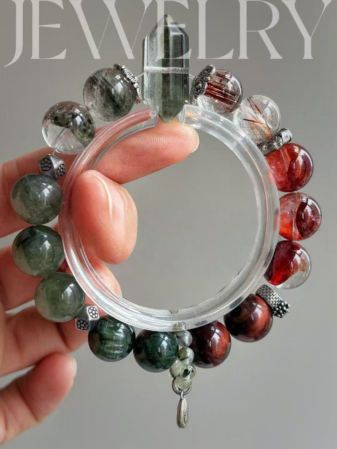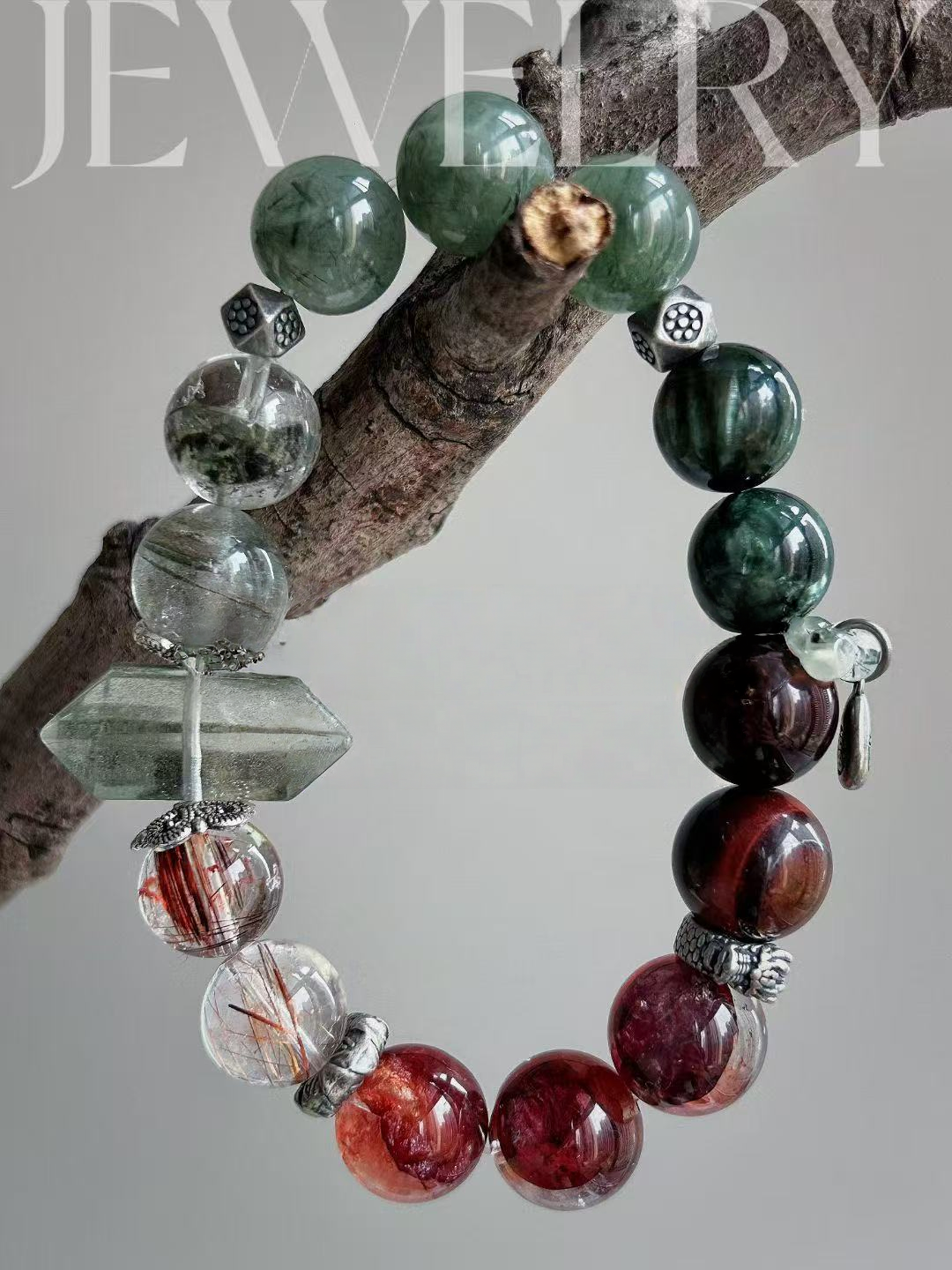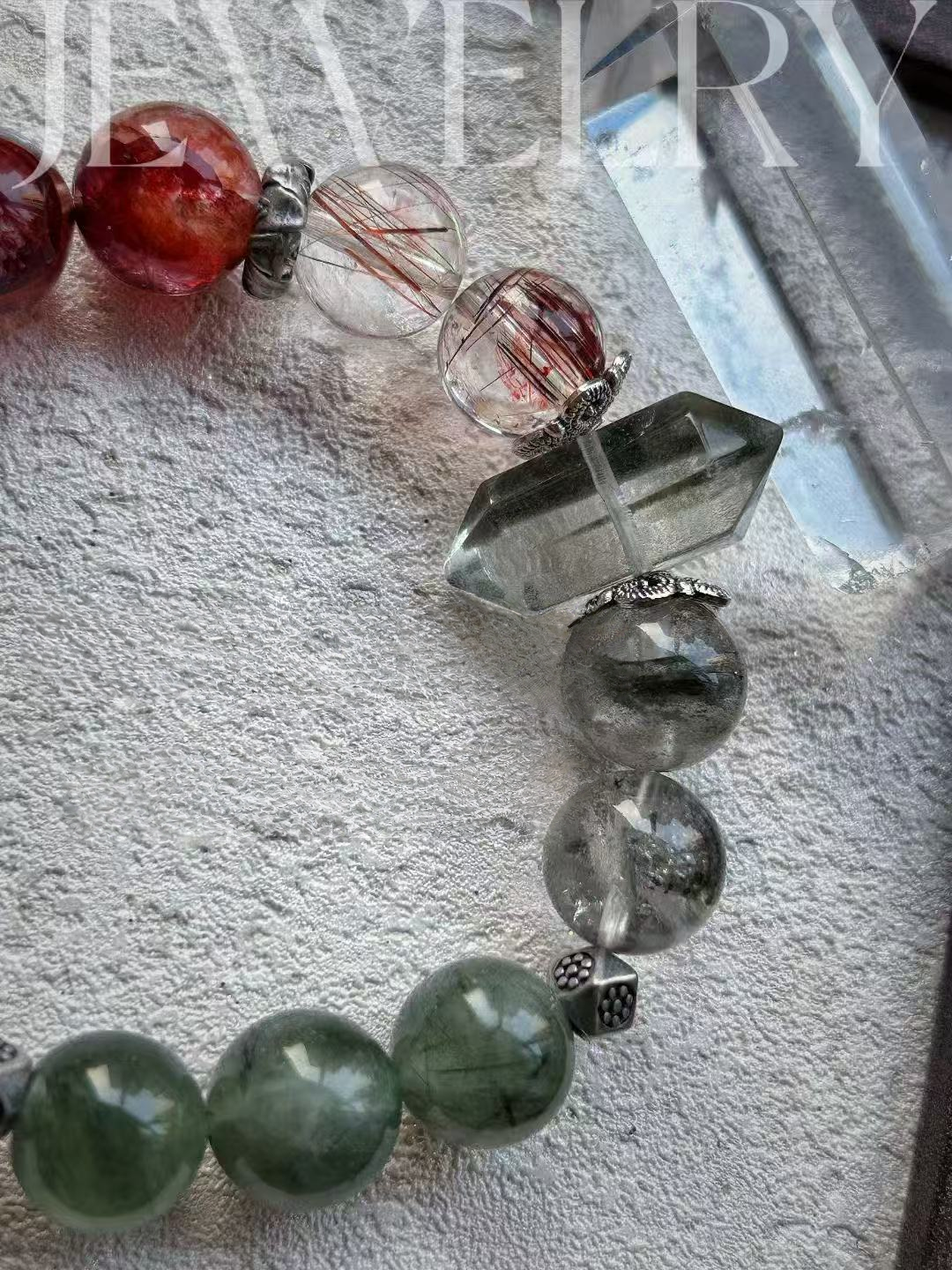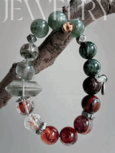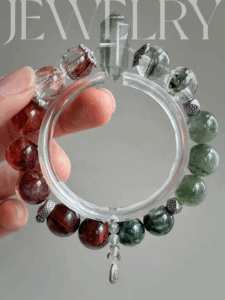 This bracelet uses high-quality crystals such as Green Ghost、Green Dragon Crystal、Copper Hair Crystal、Bull Blood Red Gum Flower and Green Hair Crystal, Sliver Accessories.