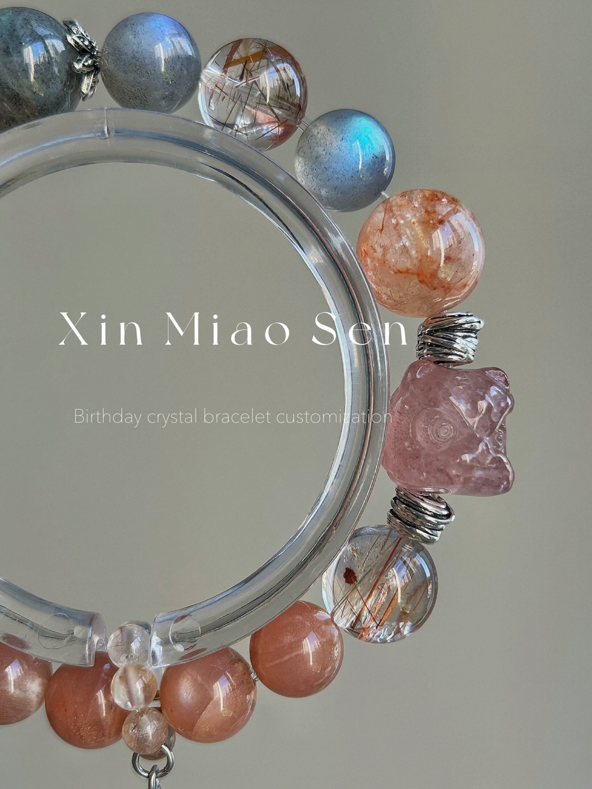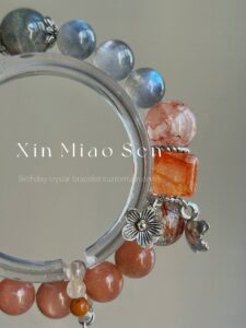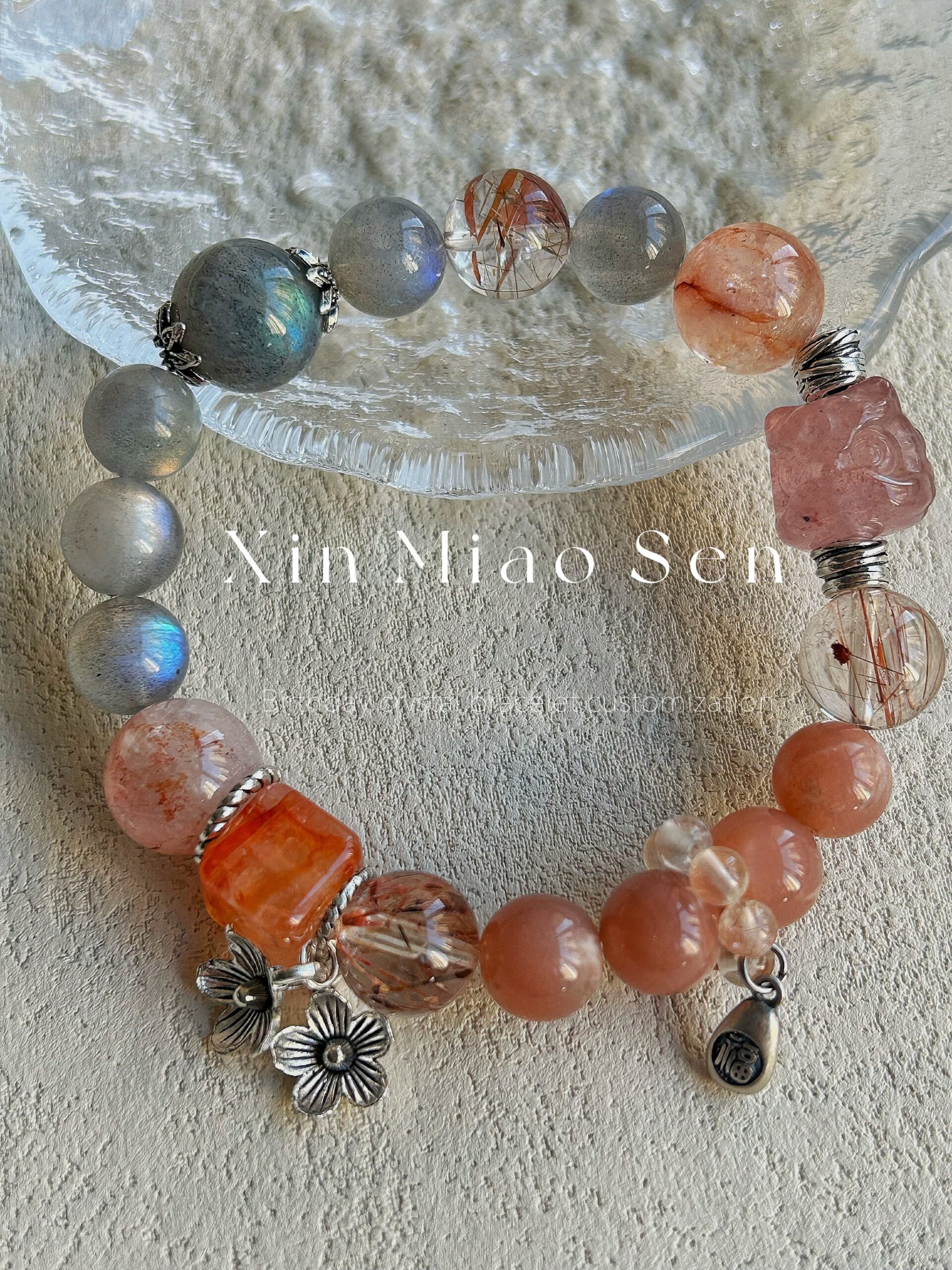 This bracelet uses high-quality crystals such as Designed with Gray moonlight (water), sunstone (fire), black gold ultra, copper hair crystal (fire), yellow gum flower (earth), yellow gum flower cube (earth), strawberry crystal lion awakening (fire), yellow hair crystal running ring (earth), floral silver jewelry and others.