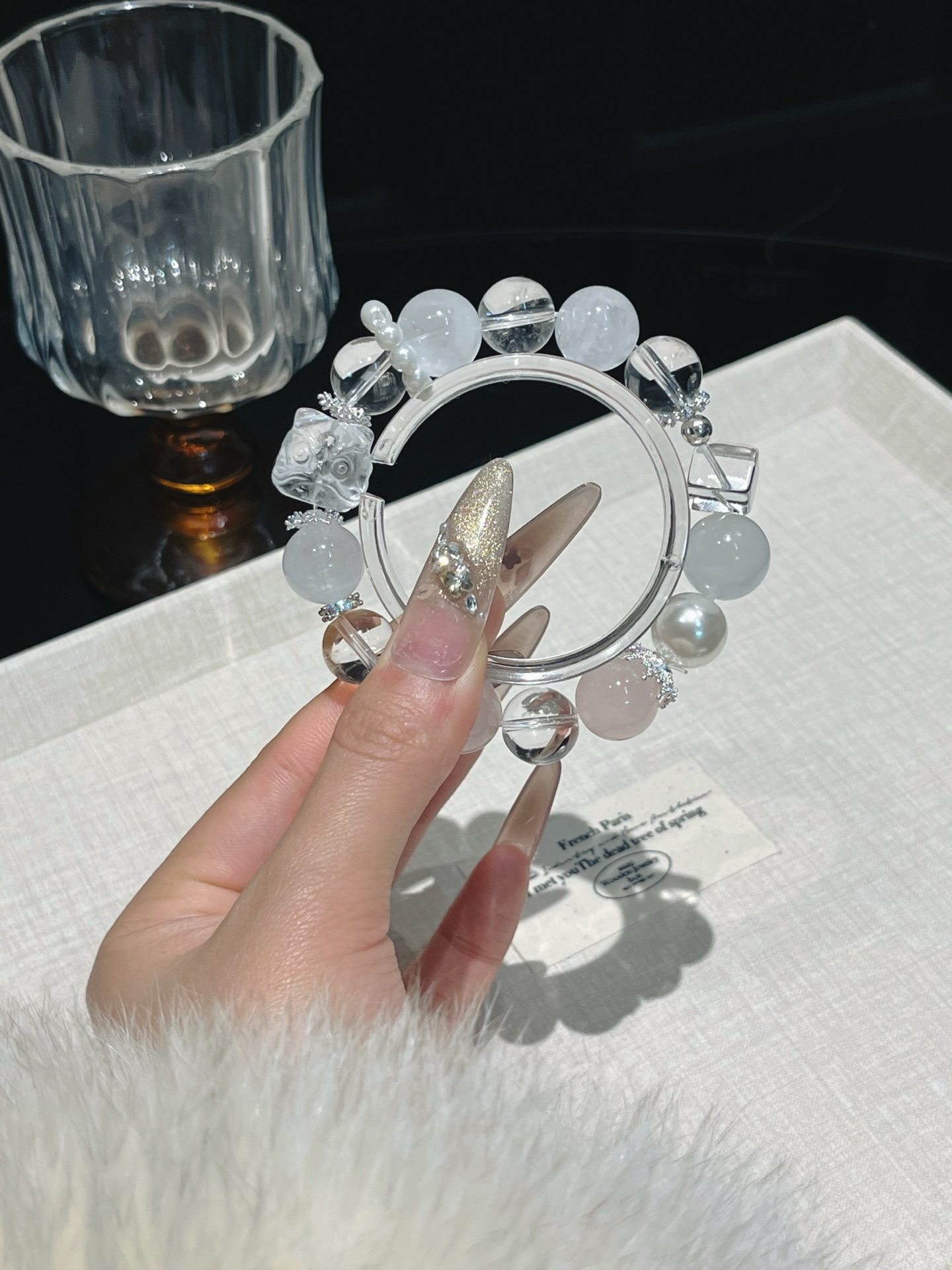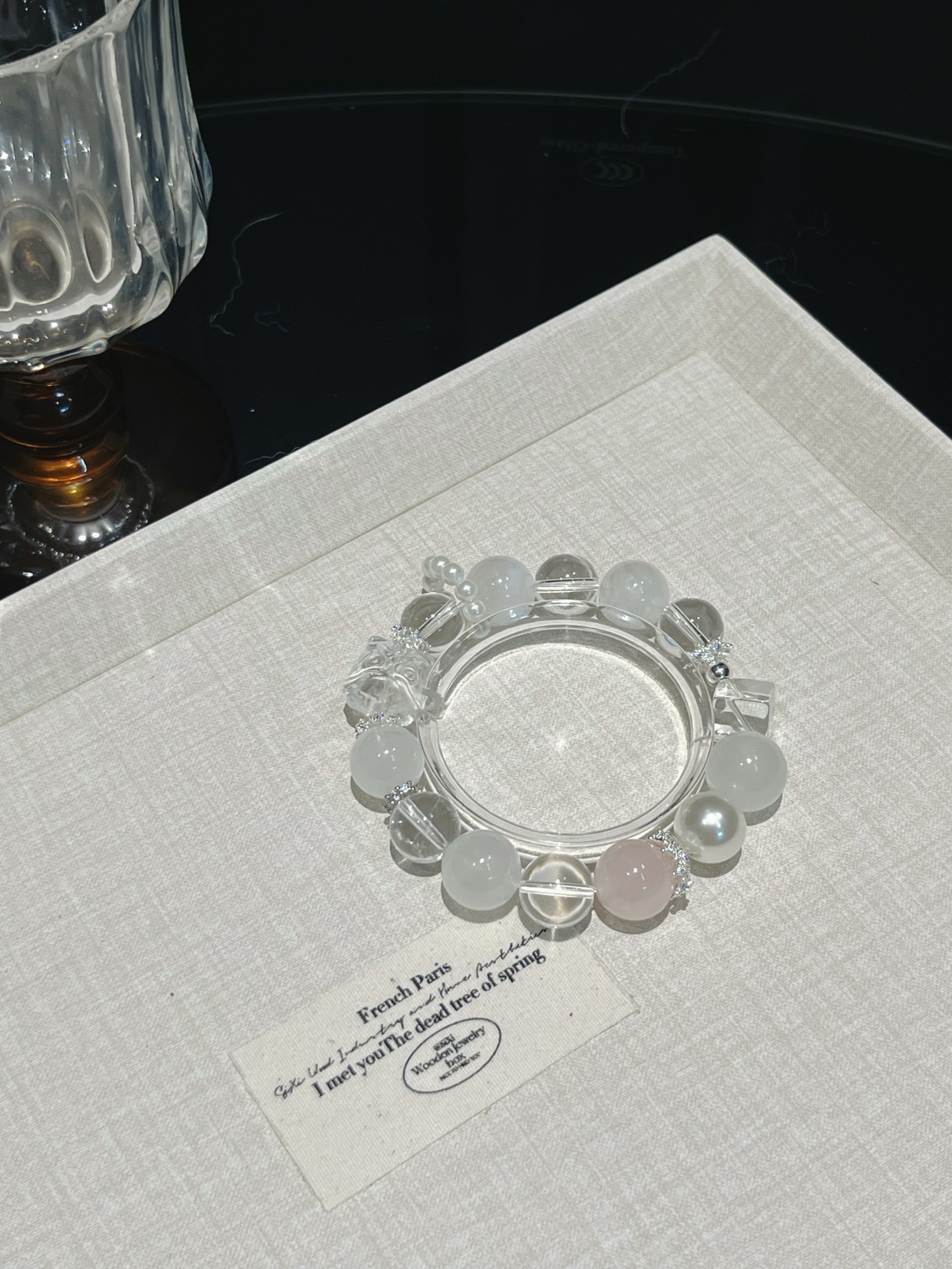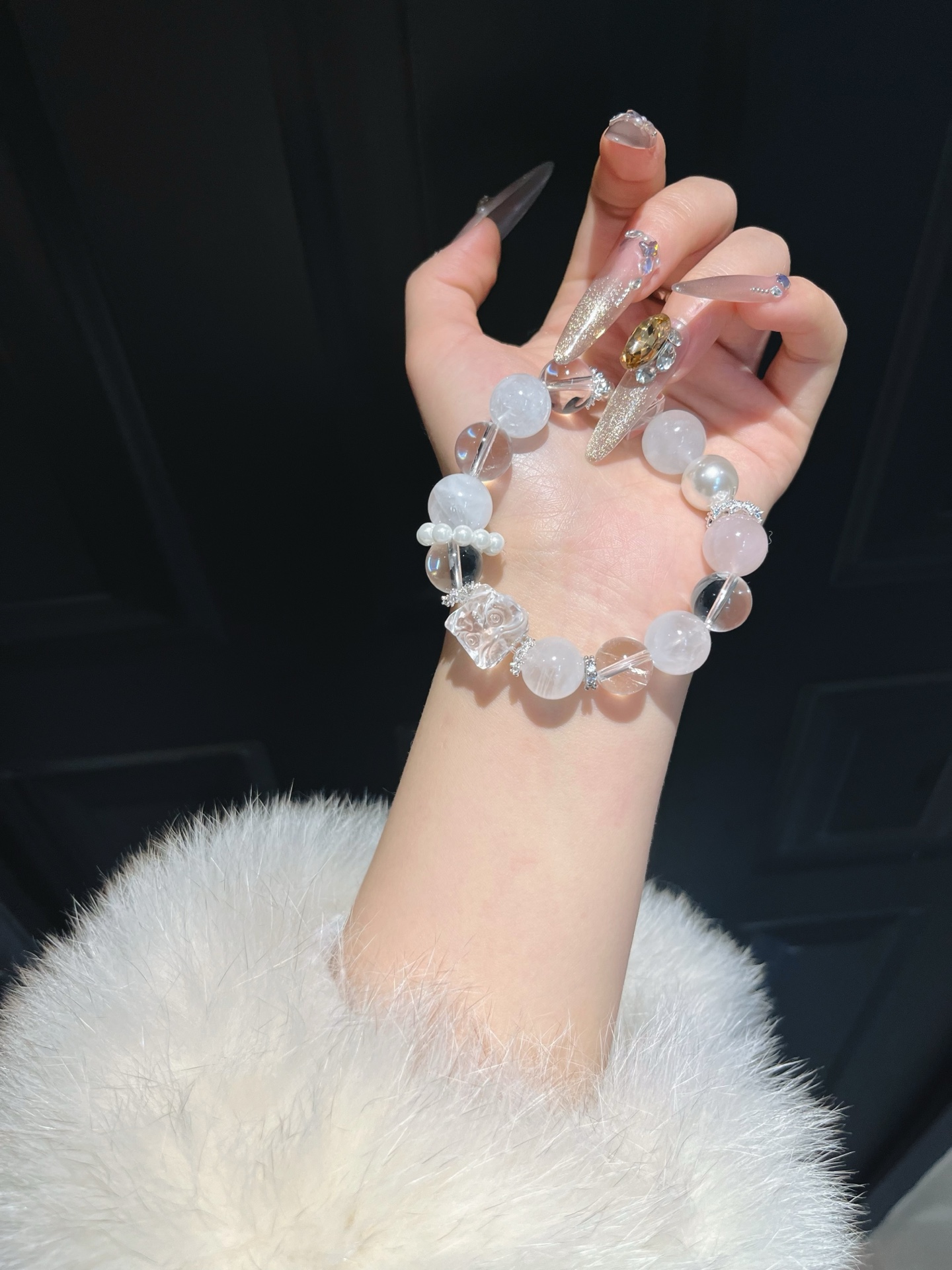 This bracelet uses high-quality crystals such as Designed with White crystal, White ghost, Pink crystal, Pearl, Silver jewelry.