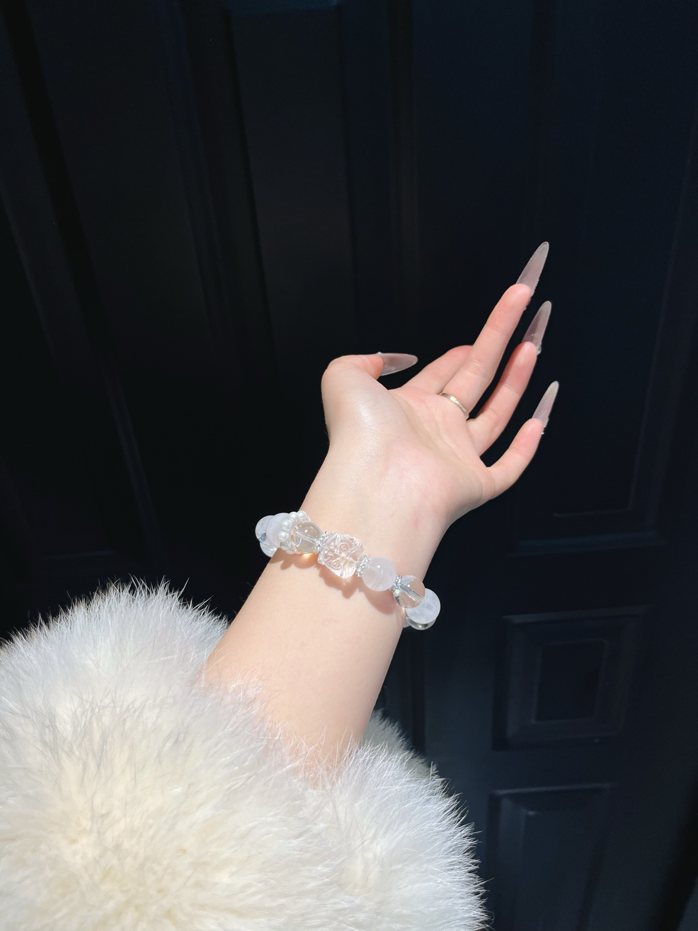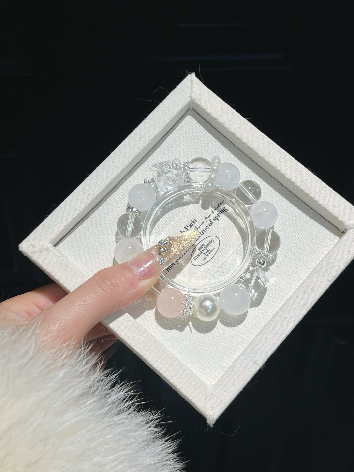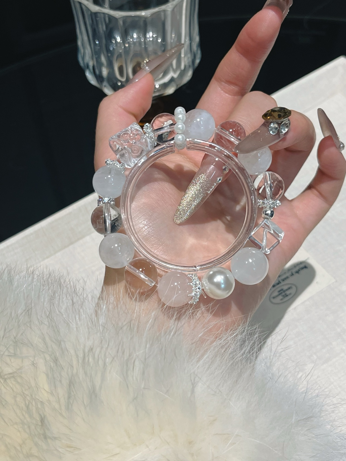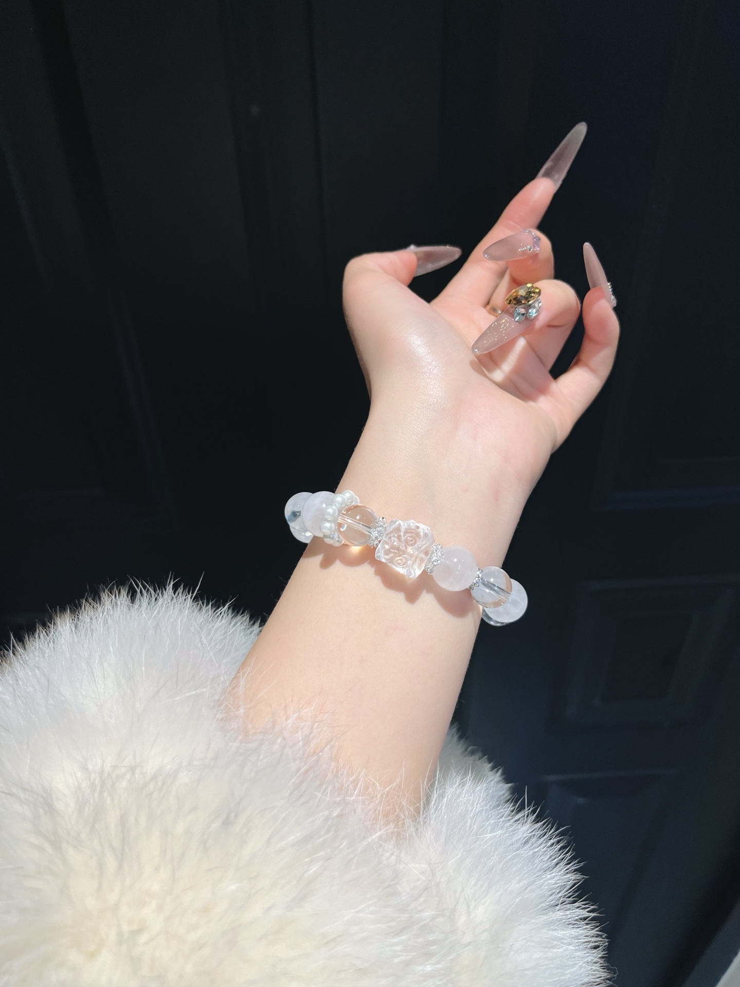 This bracelet uses high-quality crystals such as Designed with White crystal, White ghost, Pink crystal, Pearl, Silver jewelry.