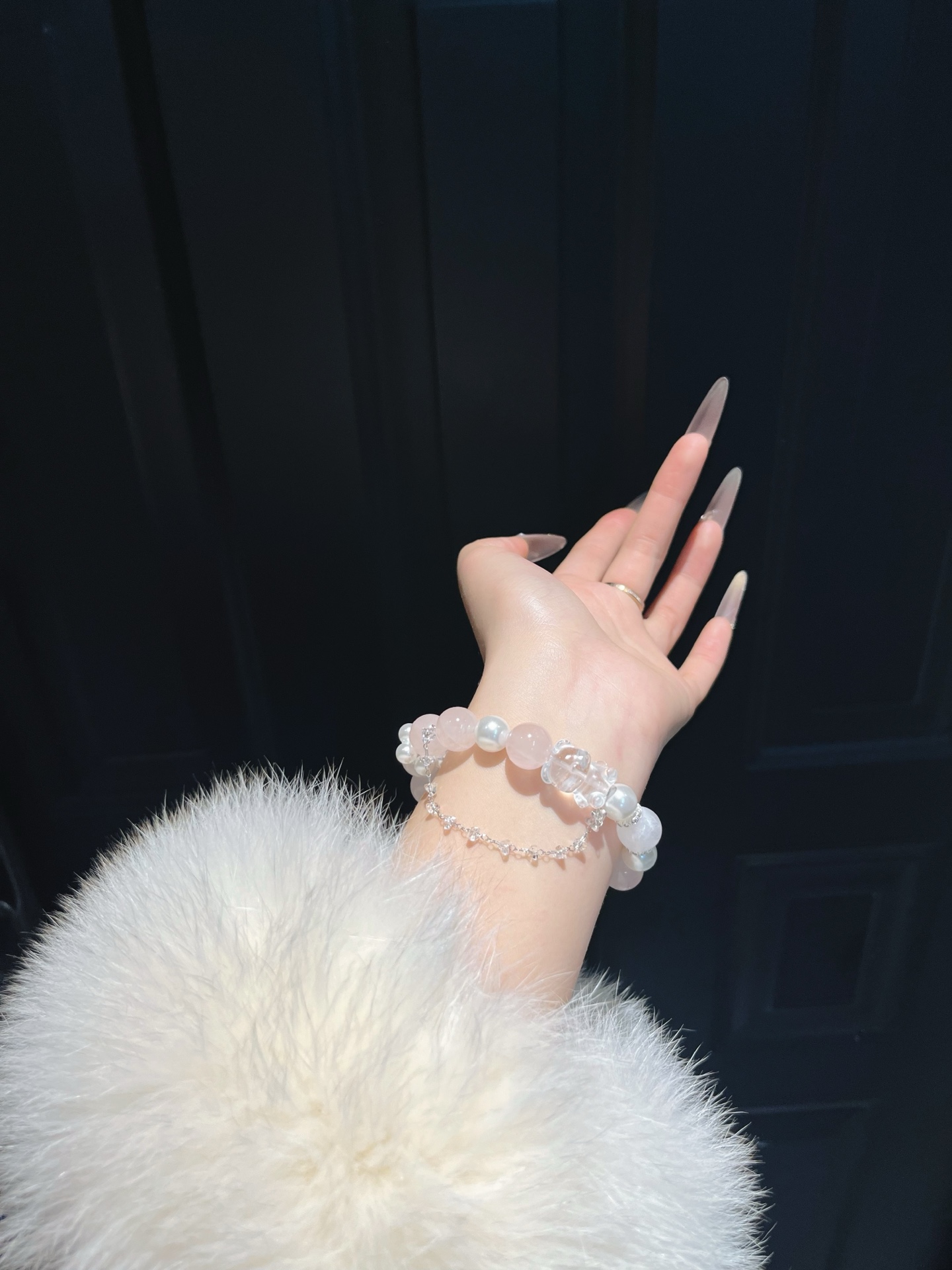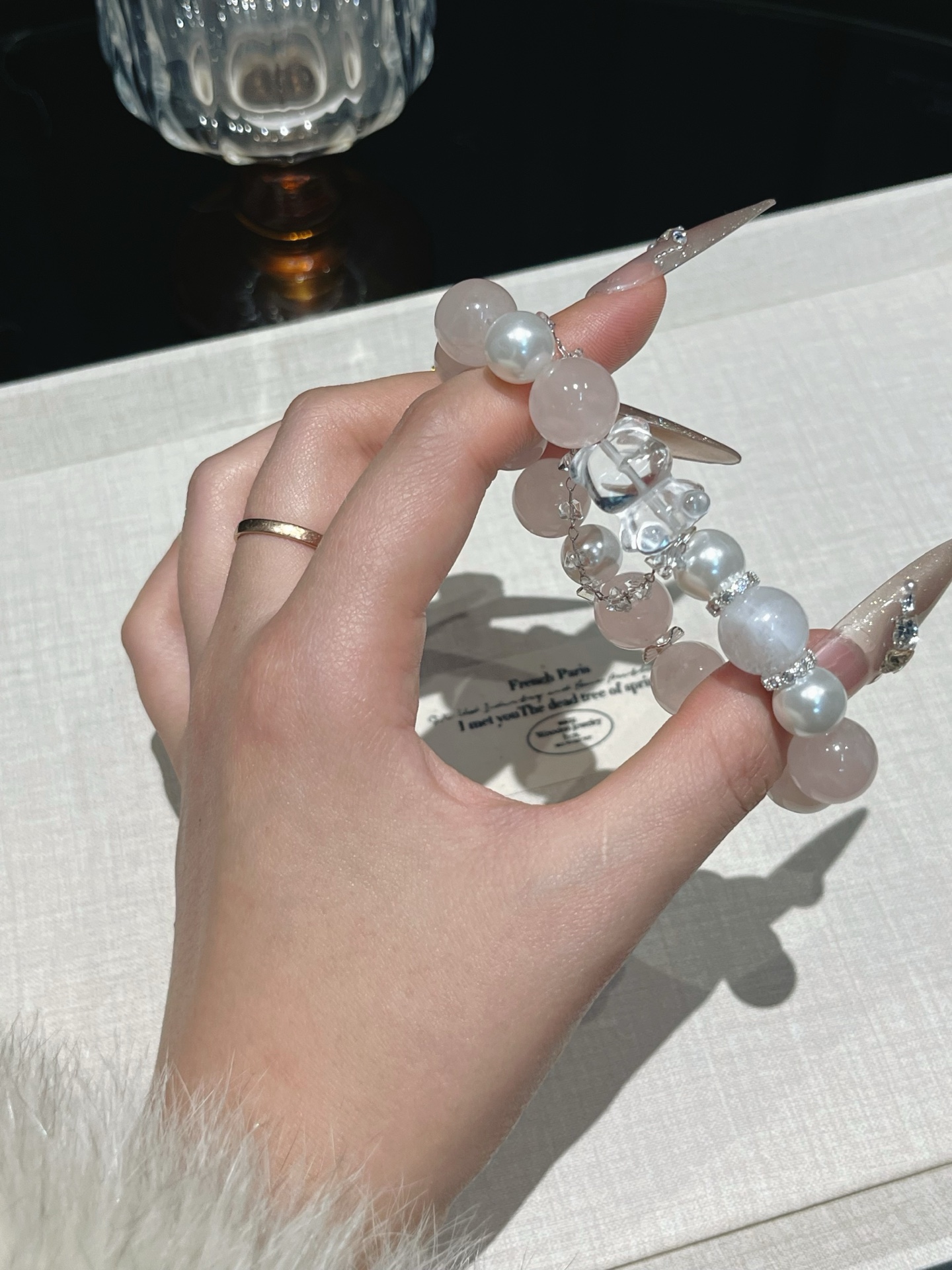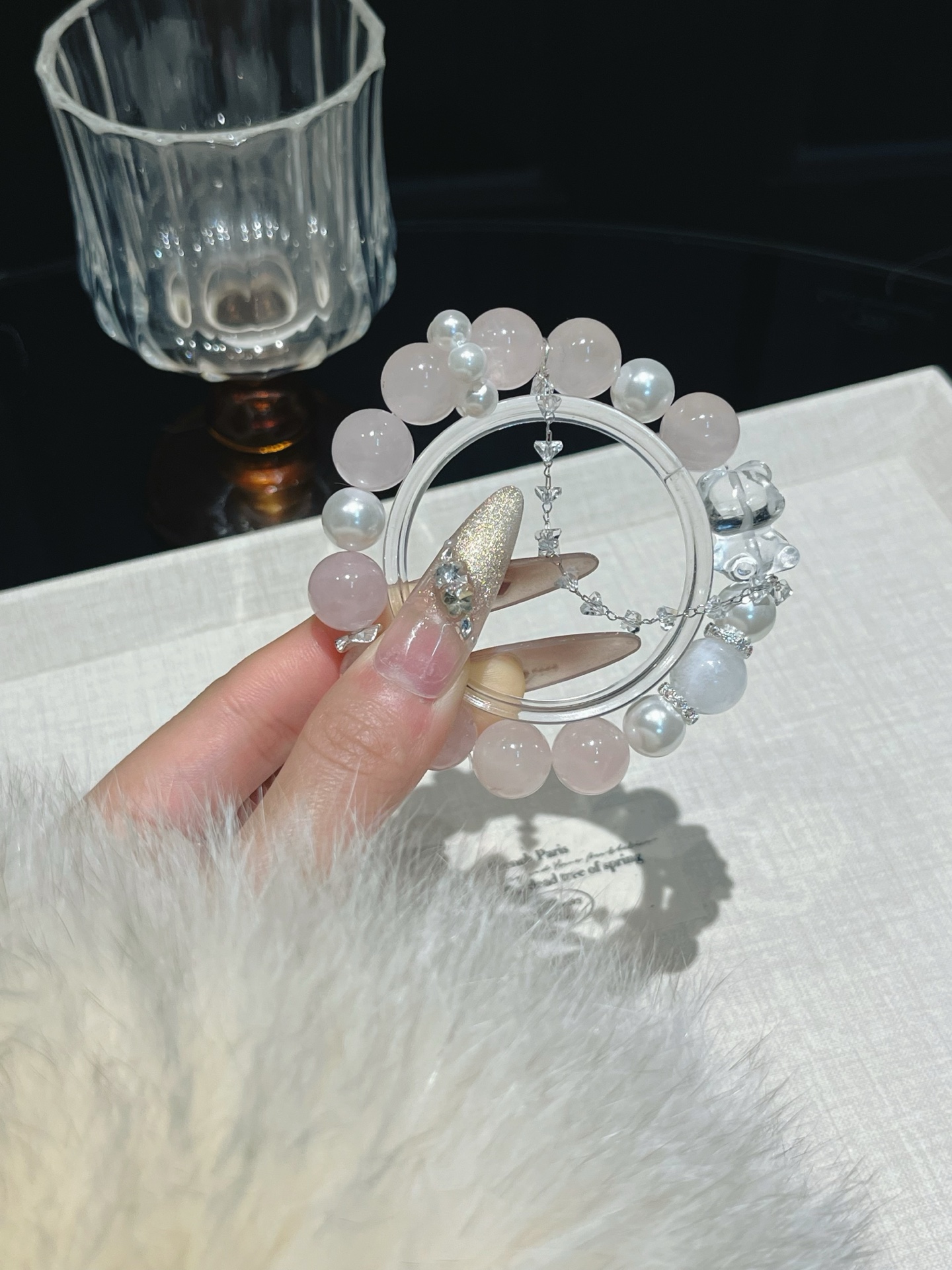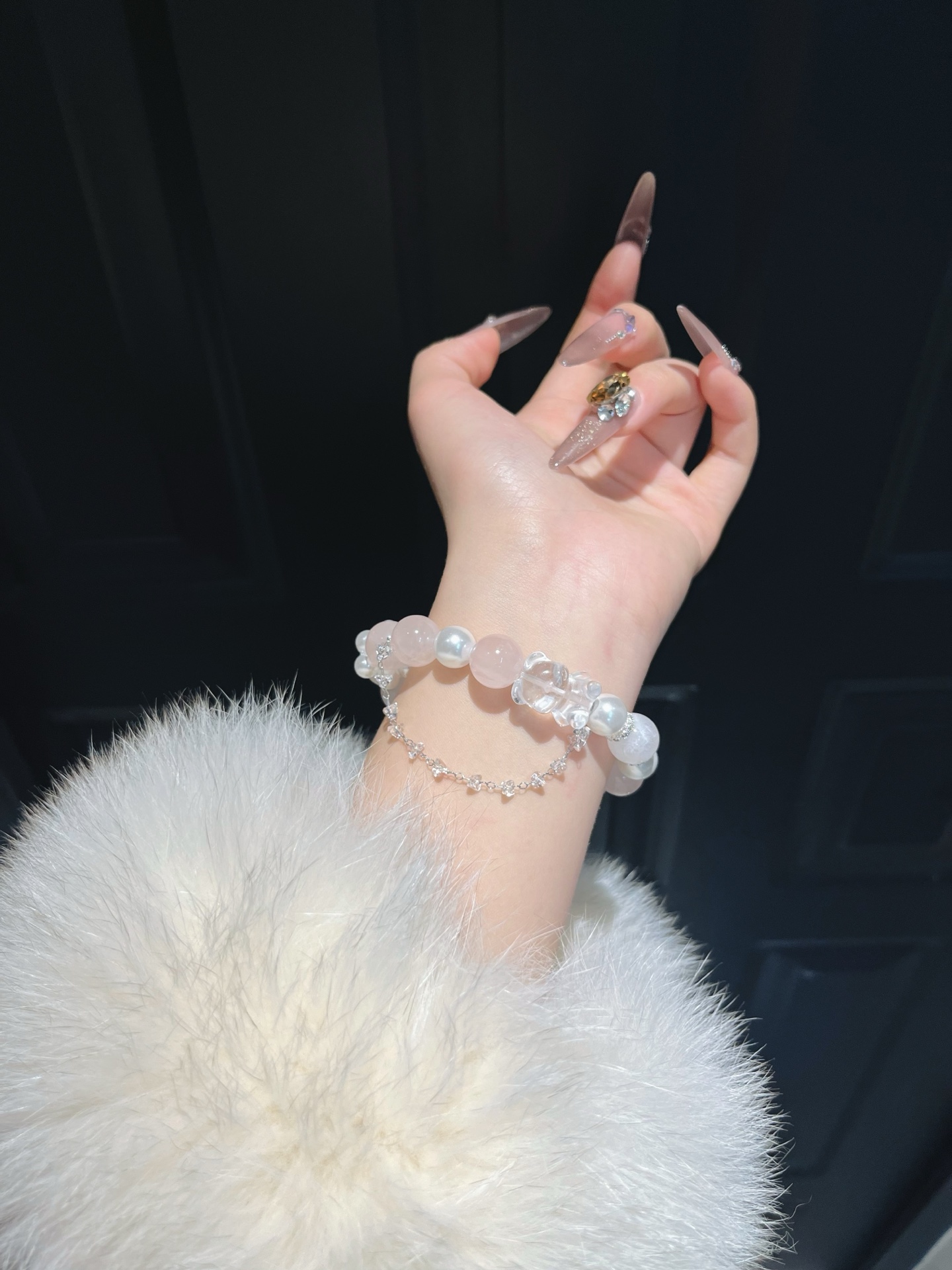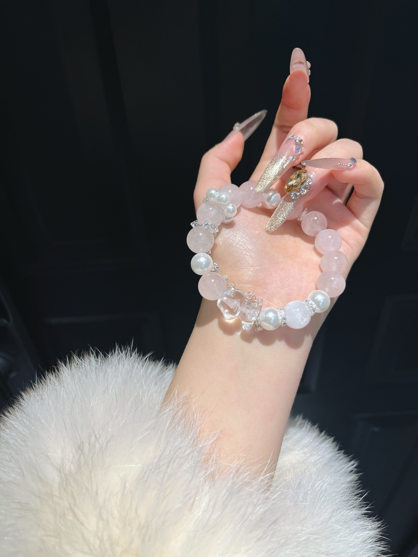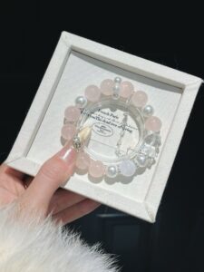 This bracelet uses high-quality crystals such as Designed with Pink crystal, White crystal, Snowflake ghost, Pearl and Silver jewelry.