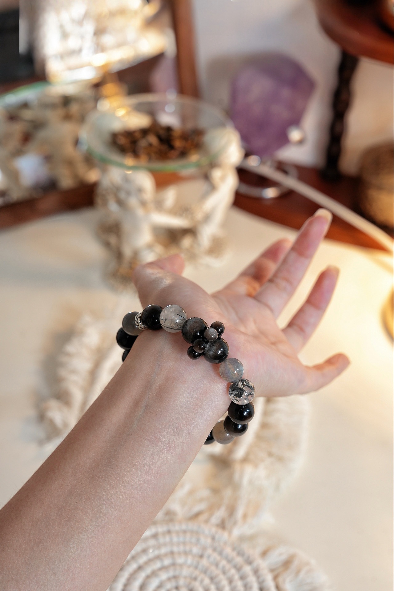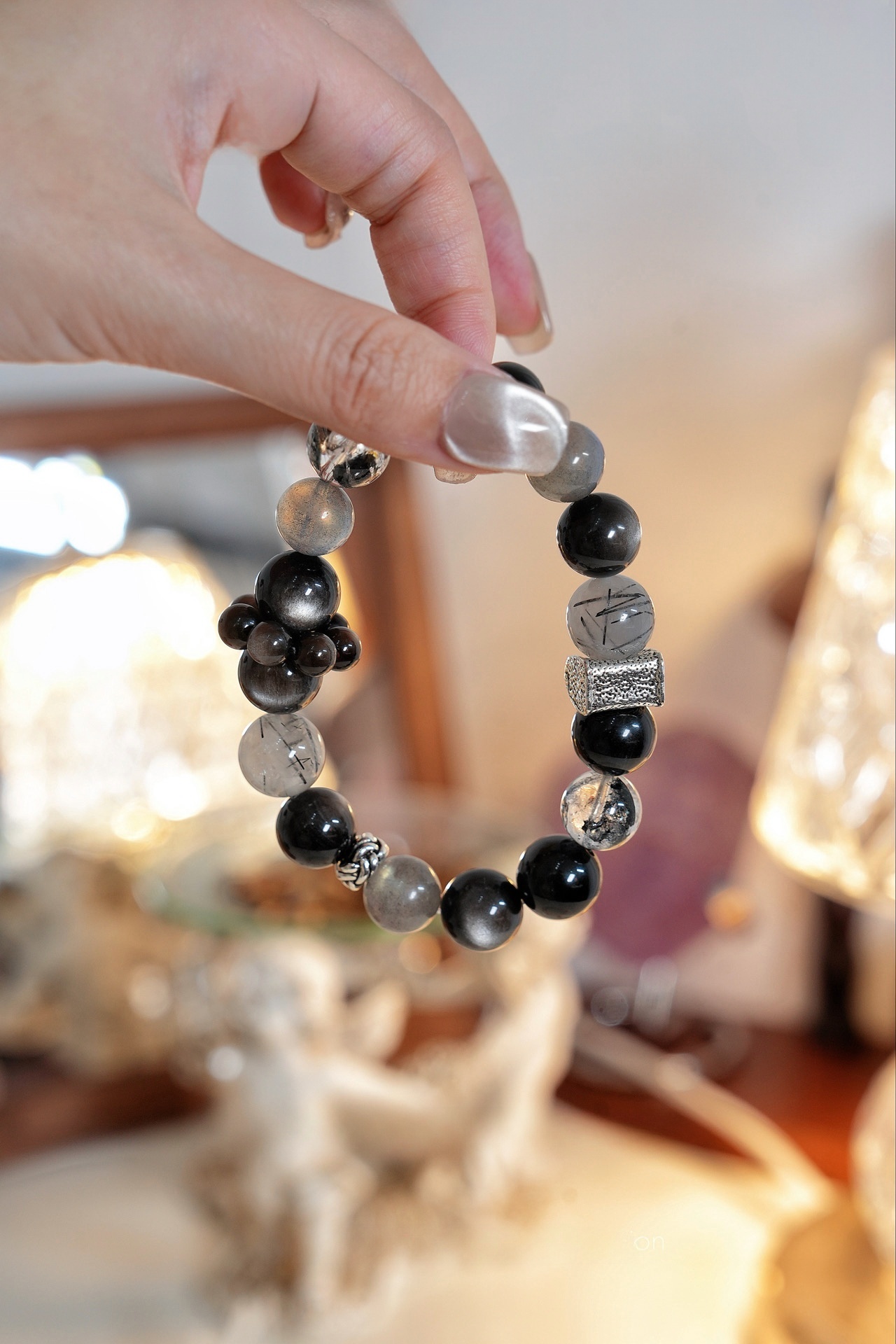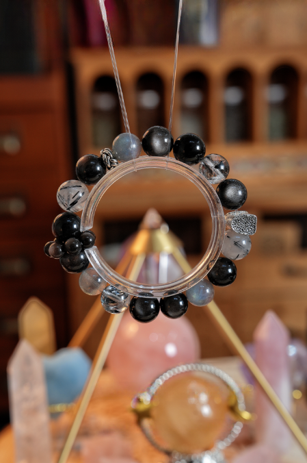 This bracelet uses high-quality crystals such as Designed with Grey Moonlight, Obsidian, Silver obsidian, Black hair crystal, Herkimer diamond, Various Other Silver Jewelry.